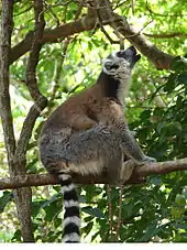 All mammalian fossils from Madagascar come from recent times.[11] Thus, little is known about the evolution of the ring-tailed lemur, let alone the rest of the lemur clade, which comprises the entire endemic primate population of the island. However, chromosomal and molecular evidence suggest that lemurs are more closely related to each other than to other strepsirrhine primates. For this to have happened, it is thought that a very small ancestral population came to Madagascar via a single rafting event between 50 and 80 million years ago.[12][11][13] Subsequent evolutionary radiation and speciation has created the diversity of Malagasy lemurs seen today.[14]