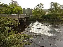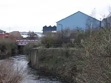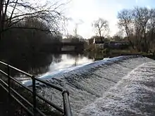 Below Oughtibridge, the course of the river is marked by a series of weirs, which were used to impound water, so that it could be used to power mills, hammers and grinding wheels. The gradient of the river bed is less than that of most of the Don's tributaries, which required the weirs to be spaced further apart, to prevent water from one mill backing up and preventing the next mill upstream from operating. The river falls by 160 feet (49 m) between Oughtibridge and Brightside, a distance of 8 miles (13 km), and by 1600, there were sufficient weirs that no new ones were built subsequently, although there were cases where additional mills were built, which used water from an existing weir. Most of the mill buildings have long since gone, but the weirs remain.[38] All of the weirs on this section of the Don followed a similar pattern, with a weir built at an angle across the river, and a goit or channel leading from the lower edge to a reservoir or dam running parallel to the river. After the works, a tail goit returned water to the river. Water supply to the dam was controlled by shuttles which could be raised to allow water to enter the head goit.[39]