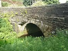 Built about 1734, this narrow stone bridge conveyed the packhorse trail from Leeds to Cheshire. It now forms part of the Trans Pennine Trail. It is listed Grade II by English Heritage.[55][56]