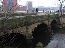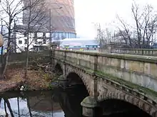 Wicker Tilts and wheel was really two works, a grinding wheel known to have been working in 1581, and a tilt forge built in the 1740s. A second tilt was added near Lady's Bridge by 1752. The grinding wheel, which supplied 36 troughs, was replaced by a wire mill in the 1870s, and was still using water power in 1895, by which time the tilts were using steam power. The weir was close to Lady's Bridge, and the head goit flowed through one of the arches of the bridge. It is thought that there are several goits in culverts near Blonk Street, but their exact extent is unknown.[48] The culverted Porter Brook joins the River Sheaf, which is also culverted, below Sheffield Railway Station, and the combined flows join the Don between Lady's Bridge and Blonk Street bridge.