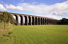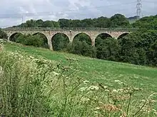 This is a curving 29-arch viaduct which is 980 feet (300 m) long and 98 feet (30 m) high where it crosses the River Don. It is used by passenger services on the route from Sheffield to Huddersfield ("The Penistone Line"). It was built in 1850 by Sir John Fowler for the Huddersfield & Sheffield Junction Railway (later the Great Central Railway). The viaduct suffered a partial collapse in 1916. The viaduct crosses the B6462 Thurgoland to Penistone road as well as the River Don.[52][53][54]
