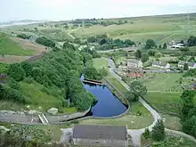 All of these reservoirs were built in the late 19th century for the Dewsbury and Heckmondwike Waterworks Board. Lower Windleden was the first to be completed in 1872, with Upper Windleden following in 1890. Winscar, Snailsden and Harden were all completed in 1899, although Winscar was called Dunford Bridge at the time.[35] A new dam was built at Winscar between 1972 and 1975, and replaced the earlier earth dam. To fit it in, without destroying the village of Dunford Bridge, the dam is built of rock fill, which allows the faces to be much steeper than those of an earth dam, and the inner face is covered with two layers of asphaltic concrete, the first such use of this material on a dam in Britain. The dam is 174 feet (53 m) high and contains around 1,180,000 cubic yards (900,000 m3) of rock fill. Another innovation in its construction was the use of a hydraulic jump pool at the foot of the overflow chute, which dissipates the energy of the cascading water. The reservoir supplies drinking water to the Calder Valley, some 12 miles (19 km) to the north,[36] and is also the base for Pennine Sailing Club, who offer basic training in sailing skills, on courses certified by the Royal Yachting Association.[37]