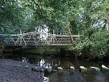 This footbridge is on the Barnsley Boundary Walk, upstream of Tin Mill Dam. It provides a drier alternative to the adjacent set of stepping stones when the river level is high. The bridge has an above-deck truss design and is constructed largely of tubular steel. It was manufactured by Tubewrights Ltd of Newport (Monmouthshire). This was a company that specialised in the fabrication of tubular steel structures. It had other factories in London, Liverpool and Glasgow and was in business from 1899 until 1981. In 1961, the company employed 1,200 people. This pre-fabricated design of footbridge was popular in the years immediately after World War II and examples can be found all over Britain.[58][59]