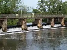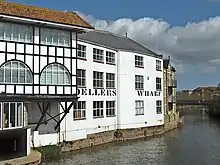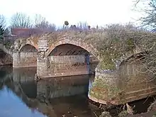 The river passes over weirs at Greenham, Tone and Nynehead, after which it is crossed by the Bristol and Exeter Railway. A disused bridge, constructed in 1817,[9] spans the river at Nynehead.[10] The river turns to the north-east near Bradford on Tone, with its two listed bridges, including the Bradford Bridge which was originally built by the 15th century,[11][12] and then to the east near Upcott bridge, where there were two mills. At Roughmoor its course is crossed by Silk Mills Road. There is a scheme to make the river navigable from here to the town centre as a way of encouraging transport with less environmental impact.[13]