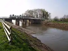 The French weir in Taunton is the head of navigation as boats can not be taken upstream of this point. As it makes its way through the town centre to Firepool weir and the junction with the Bridgwater and Taunton Canal, it passes under the North Bridge, which was constructed in 1895,[14] and Priory Bridge Road. The Brewhouse Theatre & Arts Centre, is close to the riverside.,[15] as is the County Ground, home of Somerset County Cricket Club. Next comes the A358 Obridge viaduct, the A38 Bathpool Bridge and the M5 motorway bridge. Firepool weir was reconstructed in 1967 as part of the plans to straighten the river through the town centre and down to Bathpool in order to provide better flood defences. These works swept away the remains of the original navigation. There is a disused five-arched railway bridge built in 1863 at Creech St Michael.[16] Nearby is the aqueduct that carried the Chard Canal over the river from 1842 until 1866. Ham weir stands as a reminder of the location of the lock there. After Knapp bridge, the sluice at Newbridge marks the upper tidal limit of the river. Curry and Hay Moors, an area of low-lying fenland close to the river, are a Site of Special Scientific Interest.[17] A railway bridge carries the Taunton to Castle Cary railway line over the river, after which is the Curry Moor pumping station. Two more road bridges at Athelney and Stanmoor cross the river before it joins the River Parrett at Burrowbridge, where the junction is overshadowed by Burrow Mump.[18]