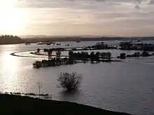 During the winter flooding of 2013–14 on the Somerset Levels, the River Tone overflowed at new year,[74] during the rain and storms from Storm Dirk, with many residents asking for the Environment Agency to resume river dredging.[75][76] On 24 January 2014, in light of the continued flooded extent of the Somerset Moors and forecast new rainfall as part of the winter storms of 2013–14 in the United Kingdom, both Somerset County Council and Sedgemoor District Council declared a major incident, as defined under the Civil Contingencies Act 2004.[77][78] As a result of the extensive flooding dredging work was carried out.[79] In addition plans were developed for a flood storage area or "Superpond" with a capacity of 1,800,000 cubic metres (64,000,000 cu ft), on the Tone at Taunton. Studies of the potential impact on the hydromorphology were carried out.[80][81]