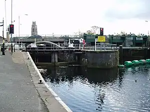 When completed in 1766, Edwards' Grand Sluice consisted of three channels each 17 feet (5.2 m) wide, fitted with pointed gates on both sides, and a lock adjacent to the north bank, which could be used as an additional flood relief channel if required.[30] The lock was originally very small, but was lengthened to its current 41 by 12 feet (12.5 by 3.7 m)[35] in 1881. The pointed doors on the non-tidal side of the sluice were replaced by steel guillotine gates between 1979 and 1982.[30]