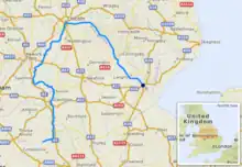 The Witham's course, which flows to the north and then to the south-east may be the result of glaciation (and possibly isostatic rebound) redirecting older rivers. The source of the river is on high ground near South Witham, Lincolnshire,[6] at around 340 feet (100 m) above ordnance datum (AOD). After briefly flowing to the east to reach South Witham, it flows generally north, passing through Colsterworth where it is crossed by the A1 road, which largely follows the line of the river to Newark on Trent. At Great Ponton, it is joined by the Cringle Brook on its left bank, and continues through Grantham, where it has already descended to 170 feet (52 m) AOD. After Barkston it turns to the west to pass through Marston. Foston Beck joins on the left bank, and at Long Bennington it resumes its northerly course. Beyond Claypole and near Barnby in the Willows it forms the border between Lincolnshire and Nottinghamshire for about 3 miles (4.8 km), before passing through an Army training area near Beckingham. The River Brant joins on the right bank, before it passes through North Hykeham to reach Lincoln, where it is only 16 feet (4.9 m) AOD.[7][6]