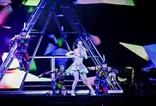 Perry first performed "Roar" at the 2013 MTV Video Music Awards, in a specially-made boxing ring under the Brooklyn Bridge, at the end of the ceremony.[118] She performed the song on Saturday Night Live on October 12, 2013.[119] While hosting We Can Survive: Music for Life on October 23, 2013, she performed the song with Sara Bareilles, Bonnie McKee, Ellie Goulding, Kacey Musgraves, and duo Tegan and Sara.[120] She also performed the song on the Australian version of The X Factor on October 28, 2013.[121] Perry then performed the song the following day at the Sydney Opera House.[122] She performed the song on German TV show Schlag den Raab on November 16, 2013.[123] On December 14, 2013, Perry performed "Roar" at the NRJ Music Awards, but suffered technical difficulties which resulted in her performance being stopped by the host halfway through who asked for it to be restarted. This led many to believe that Perry had initially been lip-syncing the performance.[124] NRJ later released an apology to Perry, stating that she had been singing live but that the wrong mix of the song was played over her live vocals, which resulted in her being visually out of sync with the backing track.[125]