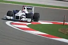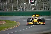 At the 2009 season opener in Melbourne, Kubica qualified fourth on the grid. During the race, he was in third place and closing the gap to the front two cars before making contact with Sebastian Vettel while trying to overtake him. After the incident, Kubica continued briefly, but crashed into a wall at the next corner because his front wing had become stuck under the car.[36] Vettel was later deemed responsible for the accident, and given a 10-place penalty on the grid for the next race in Malaysia.[37]