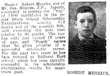 Growing up, Menzies and his siblings "had the normal enjoyments and camaraderies of a small country town".[9] He began his formal education in 1899 at the Jeparit State School, a single-teacher one-room school.[6] When he was about eleven, he and his sister were sent to Ballarat to live with his paternal grandmother; his two older brothers were already living there. In 1906, Menzies began attending the Humffray Street State School in Bakery Hill. The following year, aged 13, he ranked first in the state-wide scholarship examinations. This feat financed the entirety of his secondary education, which had to be undertaken at private schools, as Victoria did not yet have a system of public secondary schools.[10] In 1908 and 1909, Menzies attended Grenville College, a small private school in Ballarat Central.[11] He and his family moved to Melbourne in 1910, where he enrolled in Wesley College.[12] Menzies was "not very interested in and certainly incompetent at sport", but excelled academically. In his third and final year at Wesley he won a £40 exhibition for university study, one of 25 awarded by the state government.[13]