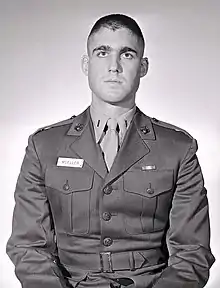 In the summer of 1968, he was sent to South Vietnam, where he served as a rifle platoon leader as a second lieutenant with Second Platoon, H Company, 2nd Battalion, 4th Marines, 3rd Marine Division.[9][26] On December 11, 1968, during an engagement in Operation Scotland II, he earned the Bronze Star with "V" device for combat valor for rescuing a wounded Marine under enemy fire during an ambush in which he saw half of his platoon become casualties.[27][28] In April 1969, he received an enemy gunshot wound in the thigh, recovered, and returned to lead his platoon until June 1969.[29] For his service in and during the Vietnam War, his military decorations and awards include: the Bronze Star Medal with Combat "V", Purple Heart Medal, two Navy and Marine Corps Commendation Medals with Combat "V", Combat Action Ribbon, National Defense Service Medal, Vietnam Service Medal with four service stars, Republic of Vietnam Gallantry Cross, Republic of Vietnam Campaign Medal, and Parachutist Badge.[9][29][25][30]