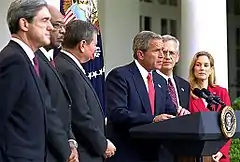 President George W. Bush nominated Mueller for the position of FBI director on July 5, 2001.[38] He and two other candidates, Washington lawyer George J. Terwilliger III and veteran Chicago prosecutor and white-collar crime defense lawyer Dan Webb, were up for the job, but Mueller, described at the time as a conservative Republican,[39][40] was always considered the front-runner. Terwilliger and Webb both pulled out from consideration around mid-June, while confirmation hearings for Mueller before the Senate Judiciary Committee were quickly set for July 30, only three days before his prostate cancer surgery.[41][42]