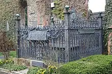 - A simple slate tomb for Owen was installed in St Mary's Churchyard in Newtown. In 1902 the co-operative movement erected Art Nouveau railings around the tomb as a monument to him.[75]