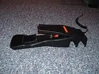 The game features special Rock Band-branded guitar controllers modeled after the Fender Stratocaster to be used for the lead and bass guitar gameplay. These are similar to the Guitar Hero controllers, as they feature five colored fret buttons on the neck, a strum bar, and a whammy bar. The Stratocaster controller has five additional fret buttons of smaller size located closer to the guitar's main body. These buttons can be used to play notes in guitar solos (denoted by the note track turning blue) as hammer-ons and pull-offs, without the need to strum.[11] Additionally, the controller features an effects pickup switch that can toggle between five different effects, which are applied in solos and when Overdrive is activated. Overdrive for guitarists can be deployed by holding the controller in a vertical position or pressing the "Select/Back" button. The controller is offered in both wired and wireless versions.[14] Harmonix confirmed most Guitar Hero guitar controllers and additional third-party controllers are compatible with the game.[11][14] The Stratocaster controller is not compatible with Guitar Hero II or III.