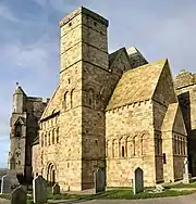 Cormac's Chapel, the chapel of King Cormac Mac Carthaigh, was begun in 1127 and consecrated in 1134.[2] It is a sophisticated structure, with vaulted ceilings and wide arches, drawing on contemporary European architecture and infusing unique native elements. The Irish Abbot of Regensburg, Dirmicius of Regensburg, sent two of his carpenters to help in the work and the twin towers on either side of the junction of the nave and chancel are strongly suggestive of their Germanic influence, as this feature is otherwise unknown in Ireland. Other notable features of the building include interior and exterior arcading, a barrel-vaulted roof, a carved tympanum over both doorways, the magnificent north doorway and chancel arch and the oldest stairs in Ireland. It contains one of the best-preserved Irish frescoes from this time period. The chapel was constructed primarily of sandstone which has become waterlogged over the centuries, significantly damaging the interior frescoes. Restoration and preservation required the chapel be completely enclosed in a rain-proof structure with interior dehumidifiers to dry out the stone. It is now open for limited tours to the public.
