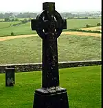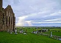 The entire plateau on which the buildings and graveyard lie is walled. In the grounds around the buildings an extensive graveyard includes a number of high crosses. Scully's Cross, one of the largest and most famous high crosses here, originally constructed in 1860 to commemorate the Scully family, was destroyed in 1976 when lightning struck a metal rod that ran the length of the cross. The remains of the top of the cross now lie at the base of the cross adjacent to the rock wall.