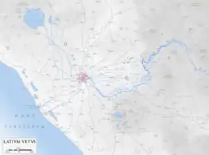 Most of Rome's aqueducts drew on various springs in the valley and highlands of the Anio, the modern river Aniene, east of the Tiber. A complex system of aqueduct junctions, tributary feeds and distribution tanks supplied every part of the city.[10] Trastevere, the city region west of the Tiber, was primarily served by extensions of several of the city's eastern aqueducts, carried across the river by lead pipes buried in the roadbed of the river bridges, thus forming an inverted siphon.[11] Whenever this cross-river supply had to be shut down for routine repair and maintenance works, the "positively unwholesome" waters of the Aqua Alsietina were used to supply Trastevere's public fountains.[8] The situation was finally ameliorated when the emperor Trajan built the Aqua Traiana in 109 AD, bringing clean water directly to Trastavere from aquifers around Lake Bracciano.[12]