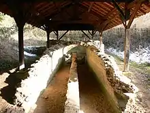 Some aqueducts supplied water to industrial sites, usually via an open channel cut into the ground, clay-lined or wood-shuttered to reduce water loss. Most such leats were designed to operate at the steep gradients that could deliver the high water volumes needed in mining operations. Water was used in hydraulic mining to strip the overburden and expose the ore by hushing, to fracture and wash away metal-bearing rock already heated and weakened by fire-setting, and to power water-wheel driven stamps and trip-hammers that crushed ore for processing. Evidence of such leats and machines has been found at Dolaucothi in south-west Wales.[73][74]