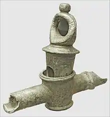 Aqueduct mains could be directly tapped, but they more usually fed into public distribution terminals, known as castellum aquae ("water castles"), which acted as settling tanks and cisterns and supplied various branches and spurs, via lead or ceramic pipes. These pipes were made in 25 different standardised diameters and were fitted with bronze stopcocks. The flow from each pipe (calix) could be fully or partly opened, or shut down, and its supply diverted if necessary to any other part of the system in which water-demand was, for the time being, outstripping supply. The free supply of water to public basins and drinking fountains was officially prioritised over the supply to the public baths, where a very small fee was charged to every bather, on behalf of the Roman people. The supply to basins and baths was in turn prioritised over the requirements of fee-paying private users.[48] The last were registered, along with the bore of pipe that led from the public water supply to their property – the wider the pipe, the greater the flow and the higher the fee. Some properties could be bought and sold with a legal right to draw water attached. Aqueduct officials could assign the right to draw overflow water (aqua caduca, literally "fallen water") to certain persons and groups; fullers, for example, used a great deal of fresh water in their trade, in return for a commensurate water-fee. Some individuals were gifted a right to draw overflow water gratis, as a State honour or grant; pipe stamps show that around half Rome's water grants were given to elite, extremely wealthy citizens of the senatorial class.[49] Water grants were issued by the emperor or State to named individuals, and could not be lawfully sold along with a property, or inherited: new owners and heirs must therefore negotiate a new grant, in their own name. In the event, these untransferable, personal water grants were more often transferred than not.[50]