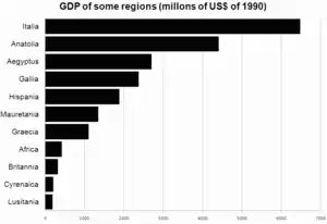 The European NDI per capita was higher than in the Asian and African provinces if Italy is included, but without it, the rest of Europe had a lower NDI per capita than the Asian and African provinces.[80] The Hellenistic Eastern provinces (Greece, Asia Minor, Syria, Egypt) were about 20% wealthier than their mostly Latin-speaking Western counterparts, with Egypt alone being about 28% wealthier. However, Italia, which was not administered as a province, enjoyed a higher per capita income than any one of them.[82]