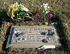 On March 8, 1973, aged 27, he was found dead of a gastrointestinal hemorrhage at his home in Corte Madera, California, by his landlady.[56] Though his contributions to the band had slowly diminished over the years, the other members were devastated at his death.[60] McKernan was buried at the Alta Mesa Memorial Park in Palo Alto, California.[55][lower-alpha 2] Garcia spoke at his funeral, saying "After Pigpen's death we all knew this was the end of the original Grateful Dead".[60]