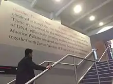 Franklin is best known for her work on the X-ray diffraction images of DNA while at King's College London, particularly Photo 51, taken by her student Raymond Gosling, which led to the discovery of the DNA double helix for which Francis Crick, James Watson, and Maurice Wilkins shared the Nobel Prize in Physiology or Medicine in 1962.[14][15] Watson suggested that Franklin would have ideally been awarded a Nobel Prize in Chemistry, along with Wilkins but, although there was not yet a rule against posthumous awards,[16] the Nobel Committee generally did not make posthumous nominations.[17][18]