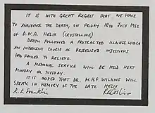 It is with great regret that we have to announce the death, on Friday 18th July 1952 of DNA helix (crystalline). Death followed a protracted illness which an intensive course of Besselised [referring to Bessel function that was used to analyse the X-ray diffraction patterns[77]] injections had failed to relieve. A memorial service will be held next Monday or Tuesday. It is hoped that Dr M H F Wilkins will speak in memory of the late helix. [Signed Rosalind Franklin and Raymond Gosling.][78]