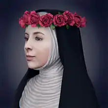 She attracted the attention of the friars of the Dominican Order. She wanted to become a nun, but her father forbade it, so she instead entered the Third Order of St. Dominic while living in her parents' home. In her twentieth year, she donned the habit of a tertiary and took a vow of perpetual virginity. She only allowed herself to sleep two hours a night at most so that she had more hours to devote to prayer.[10] She donned a heavy crown made of silver, with small spikes on the inside, in emulation of the Crown of Thorns worn by Christ.[9]