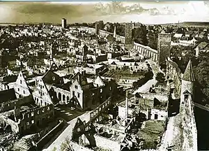 Around 32% of Rothenburg ob der Tauber, mainly in the eastern half of the town, had to be repaired or rebuilt after being bombed in World War II (with most outer walls still standing and used for the rebuild houses). Many of the rebuilt facades can now be distinguished from the surviving medieval structures as being plainer, reconstruction aiming not to replicate exactly what stood before, only to rebuild in the same style as the surviving buildings so that the new buildings would still fit into the overall aesthetic of the town.[7] Any surviving walls of bombed-out buildings were kept in their reconstructed facades as much as possible. In the case of more significant or iconic structures, such as the town hall, whose roof was destroyed, and parts of the town wall, restoration to their original state was done as accurately as possible, and they now appear exactly as they did before the war. Donations for the rebuilding works in Rothenburg were received from all over the world, and rebuilt parts of the walls feature commemorative bricks with donor names.