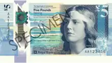 From May 2020 RBS began to replace the “Ilay” series with the new “Fabric of Nature” series of polymer banknotes. The first polymer notes, the £5, came into circulation on 27 October 2016.[39] The £5 note features Nan Shepherd on the obverse accompanied by a quote from her book 'The Living Mountain', and the Cairngorms in the background. The reverse shows a pair of mackerel, with an excerpt from the poem ‘The Choice’ by Sorley MacLean.[40]