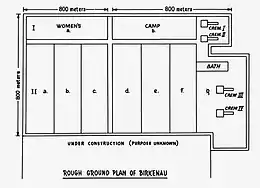 On 6 March 1944 Vrba heard that the Czech family camp was about to be sent to the gas chambers.[77] The group of around 5,000, including women and children, had arrived in Auschwitz in September 1943 from the Theresienstadt concentration camp in Czechoslovakia. That they had been allowed to live in Auschwitz for six months was unusual, not least because women with children were usually murdered immediately. Correspondence found after the war between Adolf Eichmann's office and the International Red Cross suggested that the Germans had set up the family camp as a model for a planned Red Cross visit to Auschwitz.[78] The group was housed in relatively good conditions in block BIIb near the main gate, although in the six months they were held there 1,000 died despite the better treatment.[79] They did not have their heads shaved, and the children were given lessons and access to better food, including milk and white bread.[80]