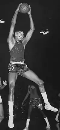 Chamberlain was the catalyst for several 1956 NCAA basketball rule changes, including the requirement for a shooter to keep both feet behind the line during a free-throw attempt.[30][lower-alpha 5] He had a 50-inch (130 cm) vertical leap,[32] and was capable of converting foul shots by dunking without a running start, beginning his movement just steps behind the top of the key.[33][lower-alpha 6] An inbounds pass over the backboard was banned because of Chamberlain.[35] Offensive goaltending, also called basket interference, was introduced as a rule in 1956 after Bill Russell had exploited it at San Francisco and Chamberlain was soon to enter college play.[36]