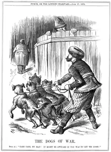MacGahan toured the stricken regions of the Bulgarian uprising, and his report, splashed across The Daily News's front pages, galvanized British public opinion against Disraeli's pro-Ottoman policy.[34] In September, opposition leader William Ewart Gladstone published his Bulgarian Horrors and the Question of the East[35] calling upon Britain to withdraw its support for Turkey and proposing that Europe demand independence for Bulgaria and Bosnia and Herzegovina.[36] As the details became known across Europe, many dignitaries, including Charles Darwin, Oscar Wilde, Victor Hugo and Giuseppe Garibaldi, publicly condemned the Ottoman abuses in Bulgaria.[37]