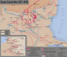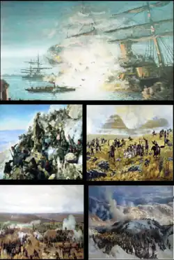 ![]() Clockwise from top left: The Action off Măcin, The Battle of Shipka Pass, The Siege of Plevna, The Battle of Aladzha, The Battle of Tashkessen | |||||||||