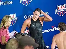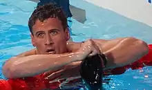 At the 2009 National Championships, the selection meet for the 2009 World Aquatics Championships, Lochte won individual titles in the 200 and 400-meter individual medley.[56][57] Lochte also qualified to swim in the 4×100 and 4×200-meter freestyle relay.[58][59] In the 200-meter backstroke final, Lochte placed second behind Aaron Peirsol, and lost his world record he set in Beijing when Peirsol recorded a time of 1:53.08.[60]