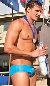 Lochte qualified for his first Olympics after finishing second to Michael Phelps in the 200-meter individual medley at the 2004 U.S. Olympic Team Trials.[24] He also qualified for the 4×200-meter freestyle relay team after finishing fourth in the 200-meter freestyle final.[25] At the 2004 Summer Olympics in Athens, Greece, Lochte swam with Phelps, Klete Keller, and Peter Vanderkaay to upset the Australian team and capture the gold medal in the 4×200-meter freestyle relay. It was the first loss for the Australian team in six years.[26][27] He also narrowly edged out George Bovell and László Cseh in the 200-meter individual medley to win the silver medal behind Phelps.[28][29]
