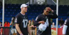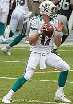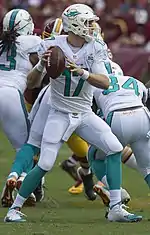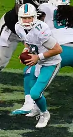 During the season-opener against the Tennessee Titans, the game was delayed twice due to lightning storms. In his return from injury, Tannehill finished with 230 passing yards, two touchdowns, and two interceptions as the Dolphins won 27–20.[85] Two weeks later, he recorded a 155.3 passer rating and threw for 289 yards and three touchdowns in a 28–20 victory over the Oakland Raiders.[86] He was inactive during the Week 6 game against the Chicago Bears due to a shoulder injury.[87] Brock Osweiler started in Tannehill's place until Week 12. In Week 14, Tannehill was part of the Miracle in Miami 34–33 victory against the New England Patriots. Trailing by five points with seven seconds left, the Dolphins had the ball at their own 31-yard line. Tannehill threw a pass over the middle that was caught by wide receiver Kenny Stills, who lateraled the ball to the right side of the field that was caught by DeVante Parker at midfield. Parker then tossed the ball to running back Kenyan Drake, who ran the ball 52 yards for a touchdown to win the game.[88][89] Over the last three games of the regular season, Tannehill struggled with a total of one touchdown and three interceptions in the three losses.[90]