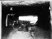 The cruiser then returned to the Rufiji River so work could begin on overhauling her engines; the parts would need to be transported overland to the shipyard in Dar es Salaam where they could be rebuilt.[19] While moored in the town of Salale, the ship was heavily camouflaged and defensive arrangements were erected. These included positioning soldiers and field guns to defend the approaches to the cruiser and establishing a network of coast watchers and telegraph lines to watch for hostile ships.[20] An improvised minefield was also laid in the delta to keep the British ships from entering the river.[21]