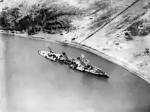 On 3 November, the British began a bombardment in an attempt to destroy or neutralize Königsberg and Somali. Königsberg was protected by the thick mangrove swamps, which concealed the ship and offered a degree of cover from British shellfire, especially while the British ships remained outside the river. A collier, Newbridge, was converted into a blockship to be sunk in the main channel of the delta to prevent Königsberg's escape. Despite heavy German fire from both sides of the river, the British successfully sank Newbridge across one of the delta mouths on 10 November, though the German raider could still put to sea via other channels. Looff decided to move his ship further upriver, to make it more difficult for the British to destroy her. In doing so, his ship would occupy a disproportionate number of British vessels that could otherwise have been employed elsewhere.[19][21] In the course of the campaign, the British reinforced the squadron blockading the Rufiji with additional cruisers, including Pyramus and the Australian HMAS Pioneer.[24]