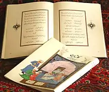 ![]() Saadi (right) in a rose garden, from a Mughal manuscript of his work Gulistan, c. 1645. | |