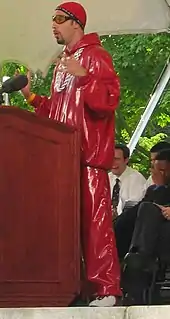 In 1996, Baron Cohen began presenting the youth chat programme F2F for Granada Talk TV and had a small role in an advertisement for McCain Microchips, as a chef in a commercial entitled "Ping Pong".[26] He took clown training in Paris, at the École Philippe Gaulier, studying under master-clown Philippe Gaulier. Of his former pupil, Gaulier says: "He was a good clown, full of spirit"[27] while Baron Cohen remarks of Gaulier, "Without him, I really do doubt whether I would have had any success in my field".[28] Baron Cohen made his first feature film appearance in the British comedy The Jolly Boys' Last Stand (2000). Also in 2000, he played the part of Super Greg for a series of TV advertisements for Lee Jeans; the advertisements never aired, but the website for Super Greg created an internet sensation.[29]