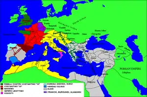 When Theodosius died on 10 January 395, the Visigoths considered their 382 treaty with Rome to have ended.[21] Alaric quickly led his warriors back to their lands in Moesia, gathered most of the federated Goths in the Danubian provinces under his leadership, and instantly rebelled, invading Thrace and approaching the Eastern Roman capital of Constantinople.[22][23] The Huns, at the same moment, invaded Asia Minor.[22]