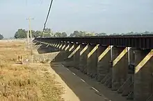 The Pit River, by far the largest of the three, begins in Modoc County in the northeastern corner of California. Draining a vast and remote volcanic highlands area, it flows southwest for nearly 300 miles (480 km) before emptying into Shasta Lake near Montgomery Creek. Goose Lake, straddling the Oregon–California border, occasionally overflows into the Pit River during wet years, although this has not happened since 1881. The Goose Lake watershed is the only part of the Sacramento River basin extending into another state.[11] Unlike most California rivers, the Pit and the McCloud Rivers are predominantly spring-fed, ensuring a large and consistent flow in even the driest of summers.[11] At the lower end of Shasta Lake is Shasta Dam, which impounds the Sacramento River for flood control, irrigation and hydropower generation. Before the construction of Shasta Dam, the McCloud River emptied into the Pit River, which joined the Sacramento near the former mining town of Kennett, submerged when Shasta Lake was filled. The Pit River Bridge, which carries Interstate 5 and the Union Pacific Railroad over the reservoir, is structurally the highest double-decked bridge in the United States (although most of the bridge piers are submerged under Shasta Lake when the reservoir is full).[12] The Upper Sacramento River canyon also provides the route for I-5 and the railroad between Lakehead and Mount Shasta.[10]