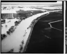 In 1873, Colonel B.S. Alexander of the Army Corps of Engineers surveyed the Central Valley's hydrology and irrigation systems and proposed a great network of pumps and canals that would take water from the Sacramento River in the north, and transport it to drought-prone central and southern California, especially the San Joaquin Valley. The Sacramento River basin receives "two-thirds to three-quarters of northern California's precipitation though it has only one-third to one-quarter of the land. The San Joaquin River watershed occupies two-thirds to three-quarters of northern California's land, but only collects one-third to one-quarter of the precipitation."[73] The topography of the Sacramento River watershed makes it particularly prone to flooding. Storm water runs quickly off the steep mountains flanking the Sacramento Valley, but with few exceptions the alluvial valley floor is strikingly flat, slowing down the runoff and causing it to overflow the river banks. Before flood control works were built, the winter floods frequently transformed the valley into an inland sea. In 1880 State Engineer William H. Hall developed the first flood control plan for the Sacramento River. Hall recognized that with the combination of flat topography and extremely heavy winter runoff volumes, a system of levees alone could not hope to contain flooding, as had been proven time and again in the flood prone city of Sacramento.[74]