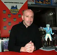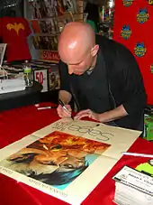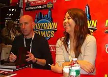 Writer Brian K. Vaughan conceived Saga in his childhood,[5][13] calling it "a fictional universe that I created when I was bored in math class. I just kept building it."[14] He was inspired by such influences as Star Wars,[13] Flash Gordon, and children's books, and has also invoked the awe and wonder of first seeing the Silver Surfer, which seemed an "incredible and different" concept to him.[15] It was not until his wife became pregnant with his second daughter, however, that he conceived of the protagonists, the winged Alana and the horned Marko, two lovers from warring extraterrestrial races who struggle to survive with their newborn daughter, Hazel, who occasionally narrates the series. It was also at this point that the central theme that Vaughan wanted for the book emerged. Vaughan explains, "I wanted to write about parenthood, but I wanted to Trojan-horse it inside some sort of interesting genre story, to explore the overlap between artistic creation and the creation of a child."[14][16] Vaughan, who intended to return to writing a comics series following the 2010 conclusion of his previous series, Ex Machina, and who notes that the publication of Saga #1 coincided with the birth of his daughter,[14] saw parallels between the caution advised by colleagues against launching a new book in the poor economy and those who cautioned against bringing a new child into the world, observing:[13]
