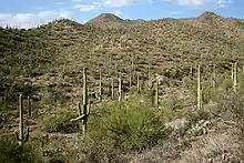 The park gets its name from the saguaro (Carnegiea gigantea),[4] a large cactus that is native to the Sonoran Desert and that does not grow naturally elsewhere.[5] Rincón—as in Rincon Mountains, Rincon Creek, and Rincon Valley—is Spanish for corner[6] and refers to the shape of the mountain range and its footprint.[7] The name Tucson derives from Papago-Piman words cuk ṣon [ˡtʃukʂɔn], meaning dark spring or brown spring.[8] Tank or Tanque refers to a small artificial pool behind a dam that traps runoff in an existing natural depression.[9] Madrean derives from Madre in Sierra Madre[10] (Mother Mountains[11]).