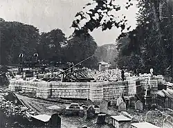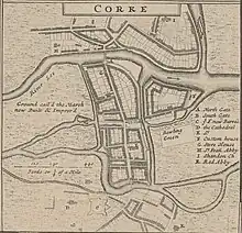 A 1644 reference to the site notes that "in one of the suburbs of Korq [Cork] there is an old tower ten or twelve feet [3.3 m] in circumference, and more than one hundred feet [30 m] high ... believ[ed] to have been built by St. Baril [Finbarr]".[7] The building was badly damaged in 1690 during the siege of Cork, after which only the steeple remained intact, due to an outbreak of fire and the impact of a 24-pound (11-kg) shot[8] from Elizabeth Fort in nearby Barrack Street. The cannonball was rediscovered during the 1865 demolition and is now on display in the cathedral.[9] The church was demolished in 1735[10] and replaced the same year by a smaller building, as part of a citywide phase of construction and renovation.[11]