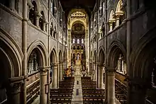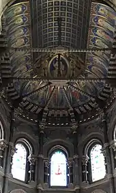 Burges designed most of the interior, including the mosaic pavement, the altar, the pulpit and bishop's throne.[52][53] The narrow and unusually high marble nave, from red and puce stone, is supported by large columns supporting the central tower and spire. The exterior gives the impression of a large structure, which is at odds with the reduced size of the interior, where the choir, sanctuary and ambulatory take up almost half of the floor space.[54] The interior is filled with colour, most especially from the stained glass windows. This aspect of the interior is in marked contrast to the uniform and austere grey exterior.[54]