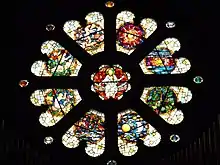The scheme begins and ends with two rose windows, at the west front and south transept respectively.[59] The west rose window shows God as the creator resting on a rainbow and in the act of blessing. He is surrounded by eight compartments, each inspired by the scenes from Book of Genesis, beginning with the creation of light, and ending with the birth of Eve, and Adam naming the animals. [60] The south transept rose window, known as the "Heavenly Hierarchies", places Christ the King in the centre, with the compartments containing a series of angels, archangels and cherubim. Separate glass sheets containing building tools are placed between each angelic compartment.[59]